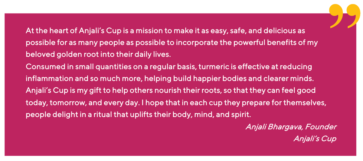 Anjali Bhargava founded Anjali's Cup in 2014 (formerly Bija Bhar) with the hope of making turmeric part of consumers' daily habits through authentic, Ayurvedic-inspired drink mixes and spice blends.